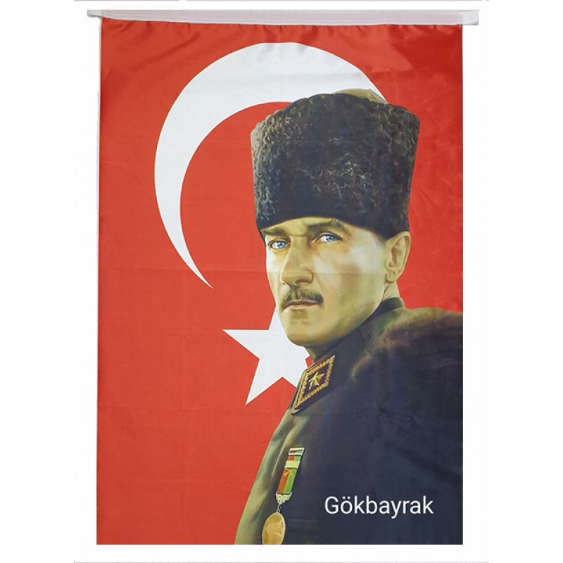 kalpaklı Atatürk posteri, Atatürk bayrak resmi imzalı tasarlayarak 100x150 cm rachel kumaşa dijital tekniği ile transfer baskı yapılarak kaliteli olarak üretilmektedir.
