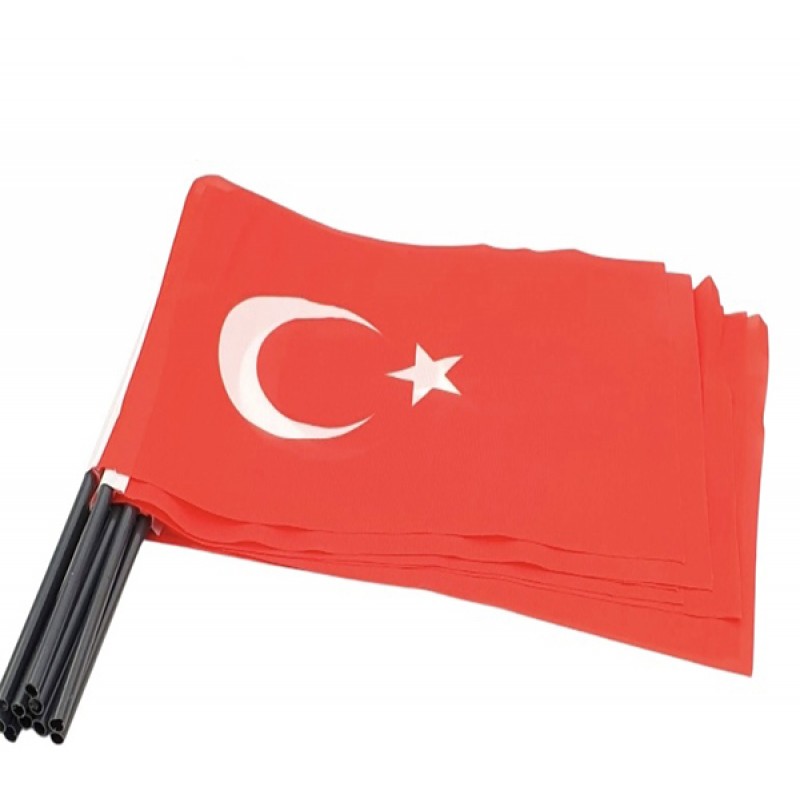 İnce tül kumaş Türk Bayrağı, el bayrağı, sallama sopalı Türk Bayrağı, milli bayramlar, karşılama, kutlama, sevinçli günlerde sallama olarak kullanılır. Sopalı Bayrak 50x75 cm ebatında olup Kenarları sıcak kesim pigmet baskı tekniğiyle fabrikasyon yapılmış olup plastik pvc 65 cm plastik Sopalı ile bilrlikte takım olarak tasarlanıp Hazırlanmıştır.