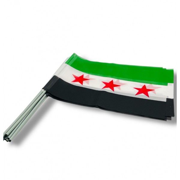 Sopalı Suriye bayrağı ince 40x60 cm El bayrağı Kullanılan yerler açık / kapalı alanlarda ve spor salonları miting, kutlama, şenlik karşılama v.s sallama el bayrağı ince kumaş (raşhel) kumaşdan üretilmiştir. suriye bayrak, miting bayrağı 40x60 cm sopalı etrafı sıcak kesim yapılmış olup 65 cm PVC plastik bayrak borusu ilen birlikte sunulmuştur.