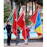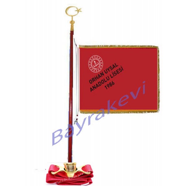 Okul flaması, törenlerde kullanılmak amacıyla ile üretilen okul flaması genel olarak ahşaptan imal edilmiştir. Bu malzemenin tercih edilmesindeki en büyük neden, bir öğrenci tarafından taşınması ve taşıma işleminin tören boyunca devam etmesi nedeni ile öğrenciyi yormayacak şekilde toren bayrağını taşıması olmasıdır Ahşap gövdeye sahip olan okul tören direkleri koruyucu malzeme ve ile kapanmıştır. Kaplanan bu malzemeler sayesinde direkler dış etkenlere maruz kaldığında deforme olmamakta ve uzun süreli kullanım imkanı sağlanmaktadır. Üzerlerine genelde okul flaması asılan tören sopası okul flamaları da kullanılmaktadır. Ahşap flama bayrak direği öğrenci tarafından taşınabilmesi maksadı ile taşıma kemeri. İle birlikte olan pirinç hamail ismi altında bir yardımcı aparatta kullanılmaktadır. Tören direğinin üst kısmında ise, pirinç. Bayrak alemi ismi verilen ay ve yıldızdan oluşan bayrak alemi bulunmaktadır. Taşıma kemerine direğin alt kısmı geçirilmekte ve kemer boyna asılarak, tören ve düzenlenen kutlama aktivitelerde kullanılmaktadır. Eğitim kurumlarında kullanılmak maksadı ile tasarlanan okul tören direk tipleri milli bayramlar ya da benzeri organizasyonlarda kullanılmaktadır. Eğitim kurumlarının haricinde bu bayrak tiplerine düzenlenen çeşitli organizasyonlarda da rastlamak organizasyonlarda bu tören direklerinin kullanıldığı sıklık ile görülmektedir. MEB, Okul flaması talimatnamesine göre ismi ve renkleri flama ölçüsü 100x150 cm kenarları sim saçaklı olarak tasarlanıp hazırlanır. Siparişlerinizde OKUL ADI ve MİLADİ açıklama bölümüne yazınız..Flamanın dış yüzü Türk Bayrağ’ı rengindedir ve saten kumaştandır. Bu dış yüzün göndere temas eden üst köşesine okulun adı ve miladi tarihle okulun tesis tarihi yazılır. Öğrencilerin ya da organizasyonu düzenleyen üyelerin askı aparatı ile birlikte, üzerinde okul flaması olacak şekilde tören direklerinde kullandıkları görülmektedir. TÖREN TAŞIMA DİREĞİ AHŞAP OLUP PRİNÇ ALEM DAHİL 270 cm UZUNLUĞUNDADIR. 30 MM ÇAP KALINLIĞI OLAN SOPALARIMIZ MAUN RENK VERNİKLİ BOYA İLE BOYANMAKTADIR. TAŞIMA KEMERİ (HAMAİL) ZAMAKTIR. 1 TAKIM FİYATI-KARGO BİZDEN!