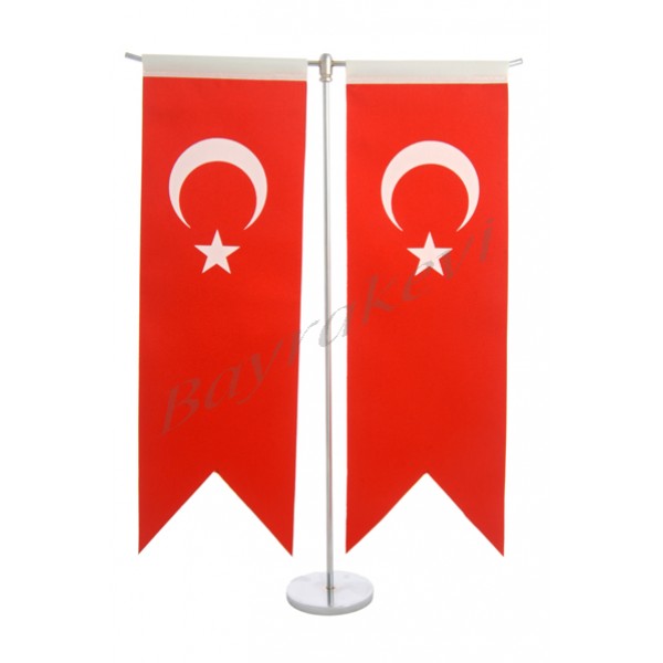 Kırlangıç Türk masa bayrağı, genel olarak masa üstü ve benzeri yerlerde kullanılmaktadır. İmalatında kristal saten kumaş ve T-tipi Krom Bayrak direği kullanılmaktadır. Kırlangıç Türk masa bayrağı,T-tipi masa bayrağı direği ölçüsü bayrak takılma yeri 10x30 cm ebatında olup Çift kat saten Kumaş üzerine Dijital baskı yapılmıştır. Parlaklığı ile çok şık ve alımlı göstermektedir. Kırlangıç şeklinde masa üstü bayrağı,çift taraflı baskı olup ,saten kumaş kullanılmaktadır